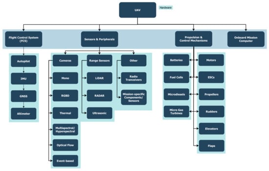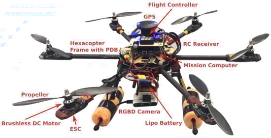 Different kinds of sensors can be used for advanced perception and planning, depending on the mission requirements, UAV available payload and power, and environmental conditions. Examples of commonly used sensors are cameras (monocular, RGBD, thermal, hyperspectral, etc.), range sensors (LiDAR, RADAR, ultrasonic) and other task-specific sensors (ex. grippers, manipulators, sprayers, etc.). A summary of hardware and software components used with UAVs are shown in Figure 2 and Figure 3, and an example hexacopter is presented in Figure 4 showing the system components for some use case.