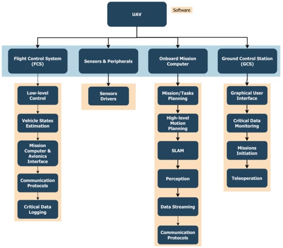 The software architecture of the autonomous stack implemented on the mission computer typically consists of several processes/modules running in parallel and a messaging middleware is used to interchange messages between processes on the mission computer or with other computers on the same network (for example, in multi-UAV systems). Some of these modules are related to the mobility aspects that can ensure safe navigation which can be common among most UAV systems and other autonomous mobile robots. Other modules would implement logic that is application-specific such that the UAV can autonomously perform the delegated task. For example, in fire-fighting applications, a UAV is needed to autonomously locate and extinguish fires, which requires additional modules to be included within the autonomous stack including computer vision pipelines and an extinguisher control mechanism. In many remote sensing applications, the main task could be only collecting data either in the form of images or information from other onboard sensors to be analyzed and processed post-flight.