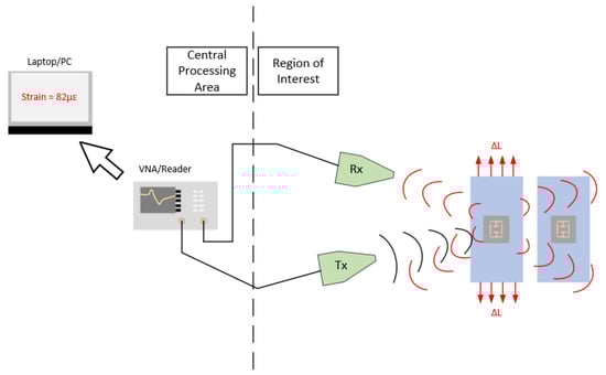 Chipless RFID sensor research is quickly becoming an area of great interest in modern power-aware application spaces. Thus far, a great deal of work has been conducted in the development of strain sensing chipless RFID sensors and many works have reviewed this body of literature in detail, including one by the authors in [1]. The envisaged strain sensing solution includes the developed sensor(s) attached to a structure of interest. A specially designed reader system would interrogate the tags in a monostatic or bistatic configuration with directive antennas that support beam steering capabilities. This envisaged reader system would readily support successful detection of resonant signatures in a variety of real-world environments. Such a system may not exist currently, but it is assumed that future reader systems could support such functionality. Finally, the datasets generated by the reader are sent to a central controller/computer for analysis, interpretation and storage. Figure 1 gives a brief overview of the envisaged system. In terms of sensor fabrication, the idealized device should be fully capable of being rapidly printed in-situ using existing direct technologies, that are controlled in an automated way.