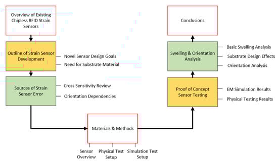This work attempts to add to the current state-of-the-art chipless RFID sensor design with a novel sensor design that, in its current instantiation, exhibits a gauge factor of 1.56. A more general approach is taken in this work towards the design of the strain sensor, so that the current resonator design could be used in a variety of different strain sensing applications. This means that emphasis was put on developing a resonator design that could be made to support an arbitrary range of strains through the selection of an appropriate substrate material. Applications for sensors of this type include aerospace structures such as those outlined in [2,3]. These applications and others will require varying strain sensing requirements. One of these requirements is minimum stimulus range, which may be as low as 0.2% or higher than 10% [4]. This paper contains two main avenues of exploration that are relevant to the development of a suitable, extreme environment-suitable chipless RFID strain sensor. These are the outline of a novel strain sensor design and an exploration of overlooked causes of chipless RFID strain sensing error, namely the effects of swelling and the effects of sensor orientation. Figure 2 presents a graphical depiction of the contents of the paper.