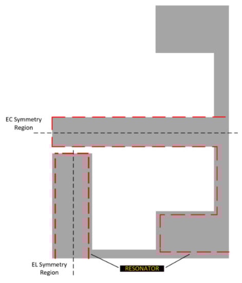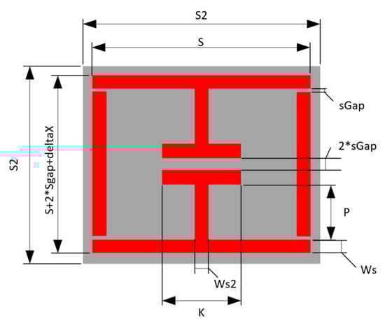 The developed strain sensor is based on the Electric-LC (ELC) resonator used in various metamaterial related publications. This resonator was considered as a base resonator through which strain sensing could be achieved as it exhibits a small footprint, and it has a large central capacitance which other works have utilissed in successful sensor designs [5,6]. From the existing literature on chipless RFID strain sensor design, it can be seen that the resonators developed make use of a variety of different deformation mechanisms to alter their resonant responses. These include elastic deformation [7,8], bending [9,10] and to some extent, rigid body motion [7]. The latter occurs when the substrate expands between conductive regions to result in a change of capacitance or a change in capacitive/inductive coupling. Another observation of the current body of literature in this area is that the use of elastic deformation or bending as the primary sensing method pushes a great deal of emphasis on the mechanical properties of the deposited conductors. A successful design of great note in this particular conversation was created by Min et al. in [11], which makes use of an AgNP/MWCNT-based deposition that supports strain levels over 20%. Other works such as that by Teng et al. in [9] rely largely on the bending of an MLA antenna and support strain levels of up to 50%. The latter work made use of the liquid metal Gallinstan to support these strain levels. Other designs have focused on the sensing of strain levels below 10000 με (1%) such as those referenced in [7,12,13,14,15]. Works of note include those by Thai et al. in [14,15] which make use of cantilever mechanisms to develop highly sensitive strain sensor designs. Although very impressive strain sensitivities are achieved with these works, they require the fabrication of a suspended cantilever which brings significant fabrication complexity to the implementation of these designs with direct write technologies. The work of Chuang, Thomson, and Bridges in [16] and other works have developed strain-sensitive resonant cavity designs that can be interrogated with RF frequencies. The designs and analysis presented in this work, however, have focused on a planar design so that it can be readily deposited in situ using techniques such as inkjet or aerosol deposition.
