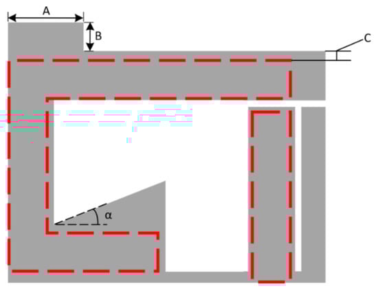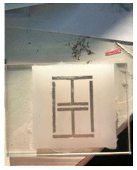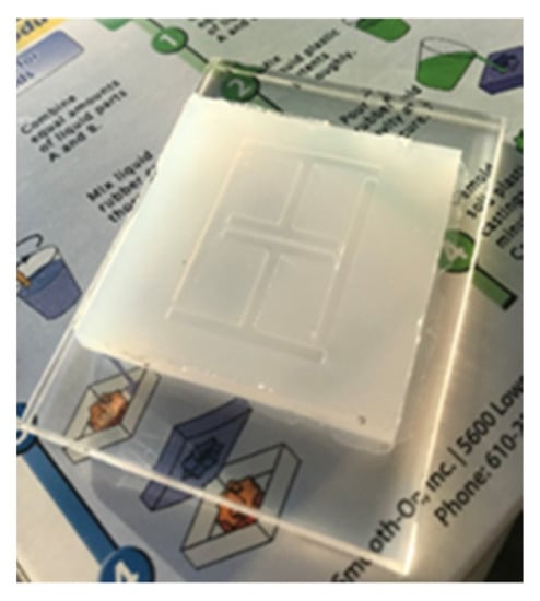 Several sensor implementations were fabricated during this work. A basic sensor was made using cheap commercial ink as a conductor material and used Ecoflex silicone rubber [39] as a substrate. Table 2 depicts the geometries of this implementations. Adhesion between the conductor and silicone substrates were achieved via submersion of the conductor inside the substrate, as the cured silicone surface was too difficult to adhere to without the use of complex surface treatments. At this point, it must be highlighted that the use of more expensive conductive inks and fabrication processes may allow for printed conductors that are more mechanically robust, but this work avoided these needs through the use of additional supporting materials. The Ecoflex silicone rubber substrates that were going to be used with the cheap ink would have trenches moulded into them (see Figure 4) to allow for the inclusion of a stiffer polymer material to sit under the conductor. This inclusion also avoided the need for surface treatment of the silicone rubber before conductor deposition. Inclusion elements were made from various plastics that were laser cut into shape and other implementations used polyester resin (ISOPON FASTGLAS) [40] deposited into the trenches using a screen-printing procedure. The cheap conductive ink was painted in place with an artist’s brush. The performance of various filler materials is not reviewed in this work but the success of using a polyester resin as a filler may allow for successful in-situ fabrication of this part of the sensor.