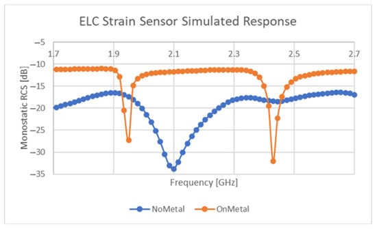 The response of the sensor design outlined in Table 2 with a polyimide substrate material can be seen in Figure 12. This response includes the response of this design both with and without a metallic superstrate. These simulations and physical testing revealed that this resonator appears to exhibit a separate resonant mode on metallic superstrates. This mode is believed to arise from a coupled monopole-based resonance occurring between the side parts of the resonator. The results referred to here, exhibited two resonant locations, one from the finite sized metallic superstrate and another occurring due to the presence of the sensor. Although promising strain-sensitive results have been gathered both in simulation and in testing, the “on-metal” resonant response appears to exhibit some strong dependencies related to substrate loss tangent and others related to the size of the superstrate. Further study is needed on the “on-metal” the performance of this device, similar to that found in [53], but preliminary results suggest that it can operate as a viable sensor on these materials.