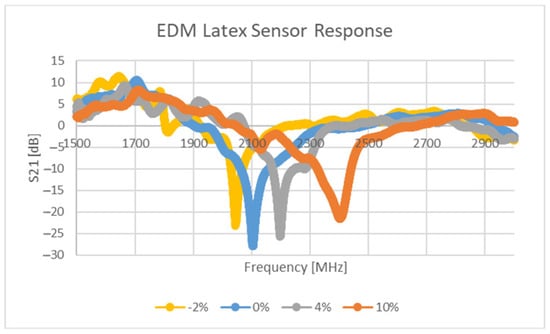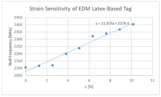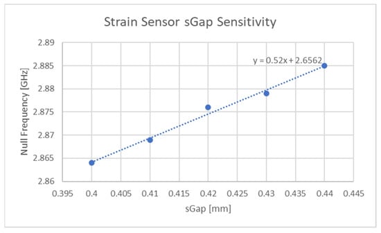 The response of the sensor depicted in Table 3 and Figure 3, for two different levels of deformation (0, 20%) are shown in Figure 15. Furthermore, the null of the sensor response against stimulus level is graphed in Figure 16. Values of S21 above 0 dB arise due to the background not including the test press and substrate during background subtraction tests. Clearly the sensor is strain sensitive, but the performance of the sensor appears weak below 3%. The authors believe that the stiffness of the resonator and the small distances between its constituent parts present a rigid region on the top surface which needs a significantly larger amount of stress to begin to significantly deform it. In this region, the direction of change in null frequency is of the same sign as that found in the larger dataset in Figure 16. Enhancing the sensitivity of the sensor in this region would require initialising the sensor with a larger “sGap” dimension or through the use of a reduced relative stiffness of the conductor to that of the substrate. The approximate sensitivity of this sensor is 32.8 MHz/%ε which corresponds to a gauge factor of 1.56.
