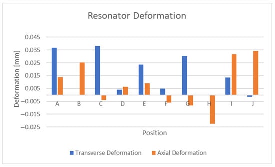 Most of the simulation results presented in this work focus on the effects of material swelling on the mechanical behaviour of the device. The geometry used to evaluate mechanical expansion included a thin substrate (500 μm) as opposed to the larger ones of the physical sensor implementations, as earlier testing revealed that the deformation of the top surface increases significantly with increasing substrate thickness. A slightly different version of the sensor design was used for this analysis and the dimensions of this device are given in Table 6. These include thermal expansion and humidity-based expansion. The latter was simulated through the use of the equivalent expansion coefficient for humidity, which is referred to as the coefficient of hygroscopic expansion (CHE). Polyimides can have anisotropic CHE values in ranges including that of 60 ppm [25] to 90 ppm [20] and this work used 90 ppm as the default value. The effects of humidity on copper were neglected as although degradation may occur, these effects occur on a much larger time scale than substrate swelling. Figure 8 depicts the labelling strategy used to characterise the resonator response and Figure 9 depicts the simulation model and converged mesh used to represent the sensor. This latter figure includes an overlaid contour plot of the total thermal deformation of the sensor under 350 °C change in temperature. As the design exhibits two planes of symmetry, only one quarter of the model needs to be simulated and symmetry or free planes can be used to represent the other sides of the sensor. The bottom of the substrate is set in place with a free plane for the axial testing and with a fixed plane for the majority of the swelling tests. The latter was chosen so as to represent a superstrate that is not experiencing any form of deformation, whether it result from external forces or thermal/humidity-based swelling. Bonded contact regions were used between the conductor and substrate parts. Axial deformation was applied to the external face of the substrate with a magnitude of 0.05 mm which corresponds to a strain of approximately 0.33%.