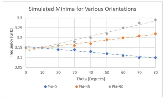 The general issue of small changes in resonant response may not be of critical importance in chipless RFID addressing as small deviations in the resonant location in the frequency response may be of little importance. This is not the case for sensing applications and several works [36,37] have described orientation-dependent properties of the resonator response and its possible connection to the 3D RCS of the tag. Avid readers are pointed towards the work of Alam et al. in [37] which peak and null radiation patterns are presented for their chipless RFID tag design which clearly show the presence of side lobes in the null response that are not present in the peak response. In such a design, it is inevitable that these side lobes will cause the measured resonant signature to vary depending on the orientation angle of the reader with respect to the tag. The results presented in this work depict this dependence. These and the results of other researchers [36,37] would suggest that it is more likely than not that many REP-based chipless RFID tags/sensors will exhibit orientation dependent responses.