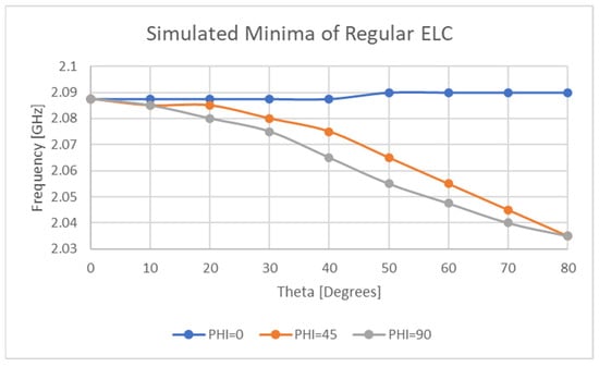 The other source of error explored in this paper is the interrogation challenges presented by this resonator design and that of a regular ELC resonator. The reason why this issue is being investigated before others is that the envisaged system in Figure 1 will consist of multiple chipless RFID sensors and a single or very few reader antennas. Therefore, some, if not all of sensors will not be orientated perpendicular to the boresight direction of these antennas. Of interest to this work is the effect of the interrogation angle in the azimuth and elevation planes on the measured resonant response of the sensor, assuming no polarization mismatches occur. Possible solutions to issues such as polarization have been outlined in other works such as [30,31,32,33,34,35] and avid readers are directed to those publications for an in-depth discussion on the challenges and solutions to polarization mismatches. The reasons why polarization mismatch is neglected in this work is that the desired strain gauge design should be sensitive in only one direction and that many of the polarization-independent resonator designs do not appear to readily allow themselves to becoming invariant to transverse strain.