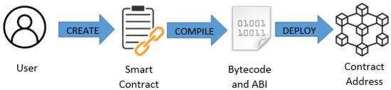 The proposed methodology utilizes Blockchain technology through the functionality of a special-structured smart contract that was created to evaluate its use. The smart contract ensures encryption and hence secure transfers of information. The purpose of skillsChain is three-fold: (i) permit the contract owner (educator) to grant access to authorized users (educational robots); (ii) allow authorized users (educational robots) to create and update student records after the completion of a task/activity; and finally (iii) allow students to view, read, and share their skills’ records. The proposed smart contract was firstly developed on Solidity [25] and then was deployed on the Rinkeby Network to evaluate its effectiveness under real-world conditions. We note that the smart contract can be executed on any Blockchain network that runs the Ethereum Virtual Machine (EVM). Figure 1 outlines the flow of the contract compilation and deployment on EVMs. At first, the contract owner creates the smart contract based on a set of specific requirements. Subsequently, the smart contract is compiled and its Bytecode, along with its Application Binary Interface (ABI), are created (the Bytecode as well as the ABI consist of essential parts for the deployment of the contract). At the final stage, the contract is deployed to the Ethereum network and a contract address that refers to the specific smart contract is generated. The users of the smart contract can execute, write, or read functions by using the specific contract address.