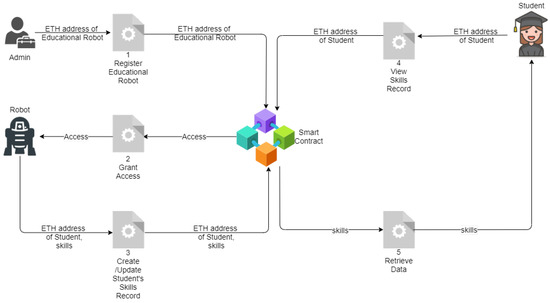 The proposed dApp, namely skillsChain, consists of three main actor: the contract owner, as known as the administrator; the authorized users, as known as the educational robots; and finally the students. The workflow of the proposed mechanism is depicted in Figure 2 and involves a series of steps which are outlined below.