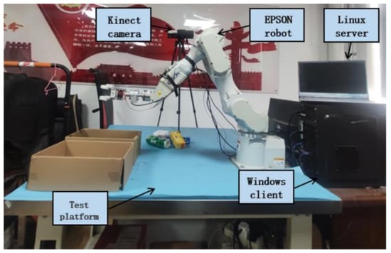 The experimental platform of sorting system is shown in Figure 1, including: EPSON C4-A901 robot, Kinect camera, Linux server and Windows client. The EPSON robot is placed on one side of the test bench, and the Kinect camera is fixed on the other side. The Kinect camera is elevated to a distance of 1 m from the desktop using a tripod and adjusted to a 75 °angle of view. The configuration between the camera and the robot in this paper belongs to eye-to-hand, that is, the camera is installed in the external fixed position of the robot. In this case, the robot–camera system is linked by four closed chains of Euclidean transformations. In this paper, the Zhang Zhengyou calibration method is used to calibrate the collected images with good exposure so as to obtain the internal and external reference matrix [,,] of the camera.