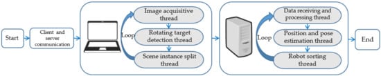The running process of robot sorting system software is shown in Figure 2. Firstly, the experimenters complete the communication between the two ends by running the server program and the client program respectively. Then the server runs the image acquisition thread, the rotation target detection thread and the scene instance segmentation thread in sequence. The image acquisition thread uses Kinect camera to obtain color images and depth images from the scene and saves the image information. The rotating target detection thread predicts the collected color images through the R3Det network to obtain the information of the target object category, position coordinates and rotation angle in the scene. The scene instance segmentation thread includes instance segmentation, point cloud processing, normal vector estimation and sorting order reasoning algorithm. The sorting order and surface normal vector of the target object can be analyzed by using the input image information.