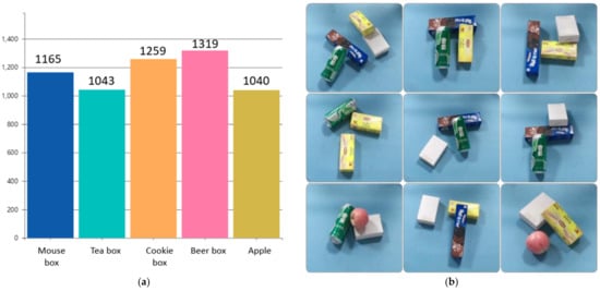 According to the above conditions, five kinds of objects suitable for grasping are selected as the target objects in the construction of data sets. When collecting images, 2~4 target objects are placed on the experimental platform. Due to the random placement of objects in practical application scenarios, objects may be stacked. Therefore, the collected image contains a variety of situations, such as separate objects, multiple objects scattered and multiple objects containing stacking. Finally, a total of 2000 images of target objects in the experimental scene were collected, with a total of 5826 entity instances. The number distribution of dataset objects and dataset images are shown in Figure 4.