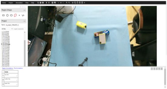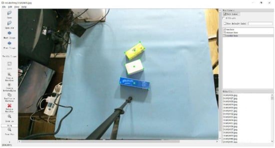 Calibration of data sets refer to PASCAL VOC [] including position information of real labels, specifications and posture of objects (rotation angle of marked border θ). RoLabelImg is the dataset tagging software we use. The specific annotation process is as follows: Firstly, draw the horizontal border, which is similar to the size of the object in the image. Then, rotate the horizontal frame to make its center point and edge coincide with the target object center point and the upper surface contour, respectively. Finally, add the object category label to the rotating border, as shown in Figure 5. After labeling, the dataset is divided into a training set with 1600 images and a test set with 400 images, and then the Python program is used to change the annotation format to the DOTA dataset format (four corner coordinates of the rotating border) for training the neural network model.