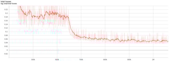 Neural network training is monitored by Tensorboard, and the overall training loss is shown in Figure 7. It can be seen from the figure that the loss gradually decreases at the initial stage and then tends to be stable, and the ladder-like decline occurs at the global step number of about steps, which is caused by the segmented decrease of learning rate. In a certain stage of neural network training, if the learning rate is large, it will lead to the model crossing the local optimal solution. When the learning rate decays, the loss continues to decline, and the model finally converges.