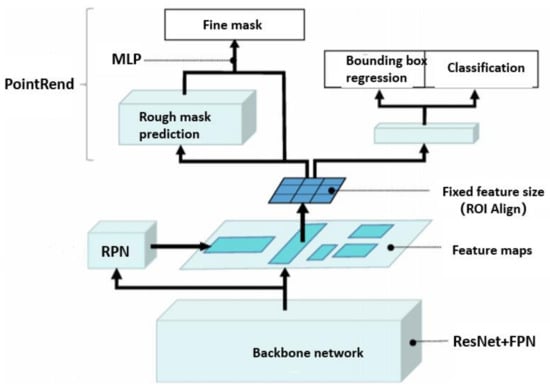 The overall framework of the optimized Mask R-CNN model is shown in Figure 9. The basic framework is mainly divided into backbone network (ResNet + FPN), regional proposal network (RPN), region of interest alignment module (ROIAlign), classification branch, regression branch and mask branch (Point Rend). Similar to Faster R-CNN, the optimized Mask R-CNN is also a two-stage network model. The main workflow is as follows: Firstly, the input image is processed by the feature extraction network composed of ResNet and FPN, and the multi-scale feature map is generated as the input of the subsequent network. Then the anchor of the corresponding scale is fixed on each feature map to generate the ROI. The RPN network makes a preliminary classification and border regression of the input ROI and filters ROI to generate region proposal. Then, the generated region proposal is input to ROI Align to align the original graph with the feature graph and convert the feature graph to the same size. Then, it is divided into two routes. One route predicts the category and location of ROI, and the other Point Rend branch predicts the mask of the input ROI and finally obtains the high-resolution mask.