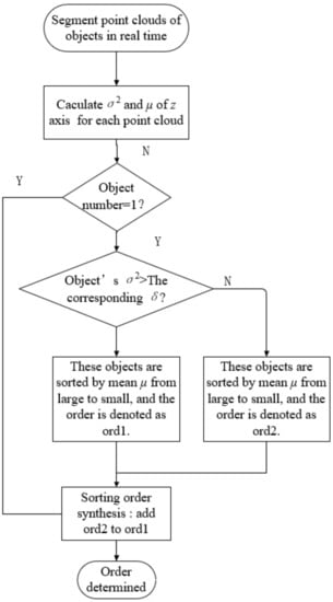 The obtained threshold of the variance of the point cloud on the object surface is used as a priori knowledge to judge the stacking of objects in the scene. In the multi-object sorting task, through the calculation of the real-time segmentation of the object surface point cloud, the variance and mean in the z axis direction are obtained. Then the size between variance and threshold is compared, and the reasonable sorting order is deduced by combining mean . The specific algorithm process is shown in Figure 16.