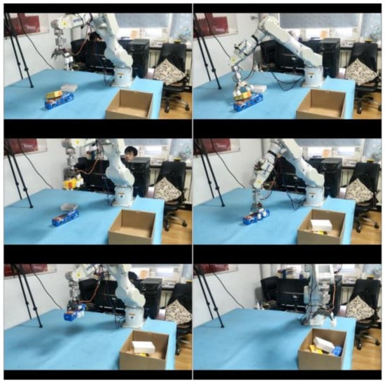 The method proposed in this paper is not only applicable to the capture task of single-class objects but also to the sorting task of multiple-class objects. The specific sorting process is as follows: Firstly, different kinds of objects (2~4 per time) are stacked randomly on the experimental platform. The subsequent operation is described in Section 7.2.1. The difference is that the data transmitted from the Linux server not only contain the location information of the object, but also the category information of the object and the grab sequence information (obtained from Section 6.3). After starting sorting task, the robot will sort all the objects on the desktop orderly and move the objects to the specified location. The grasping process is shown in Figure 20.