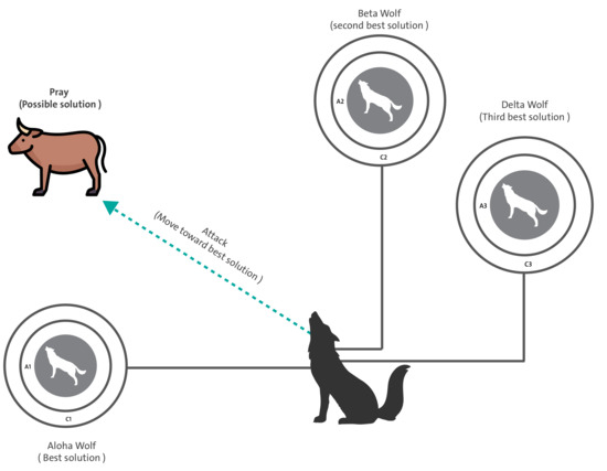 Briefly, GWO arranges the wolves in the pack based on their fitness into four levels: is the best candidate solution found so far, the second-best candidate solution found so far, is the third-best candidate solution found so far, and are the remaining solutions in the pack (see Figure 2). The hunting behavior of wolves is modeled by emulating two processes: encircling prey and then hunting it.