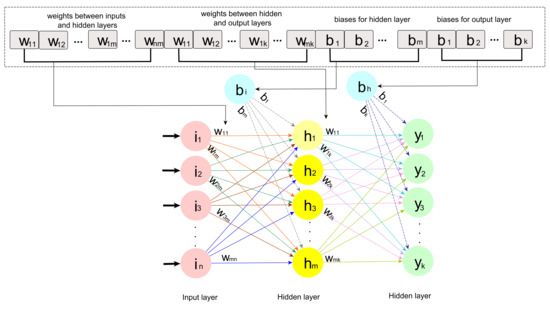 where m is the number of neurons, d is the number of input data (features). Therefore, the total number of weights and biases n is found based on Equation (16).