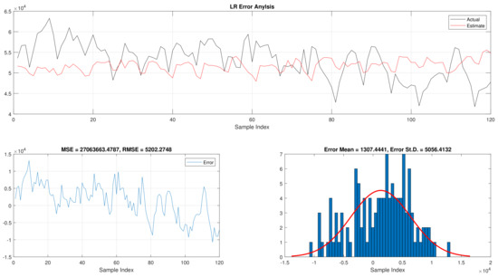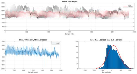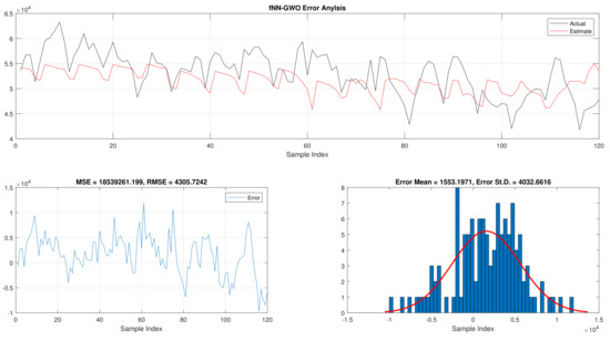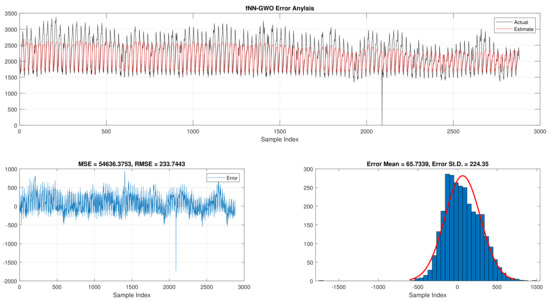 When comparing the best results for fNN-GWO in the hourly daily load consumption with LR as seen in Table 3. The fNN-GWO exceeds the LR in all measures with a difference of 39,534.03, 3453.46, 49.79, and 64.36 for MSE, ED, MAE, and RMSE, respectively. The error analysis of the hourly daily load consumption for both methods can be found in Figure 5 and Figure 6. The Figures show the best run for fNN-GWO and LR and the actual and estimated results and error. Besides, the best run for MSE and RMSE results were shown.