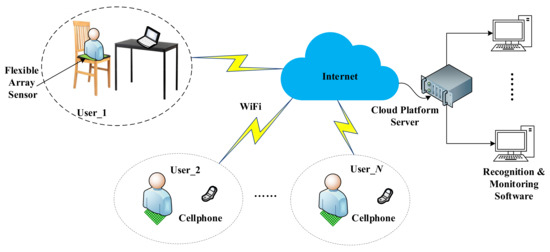 The framework of the proposed sitting posture recognition system is shown in Figure 1. Each user is sitting on a special chair equipped with a flexible array pressure sensor, and we self-made data acquisition system to collect real-time pressure values and users have the power to choose whether to transmit it to the Internet. If certain user agrees, his sitting posture information would be uploaded to the cloud platform for better management. Users can check information about their sitting postures via their cell phones or computers, the recognition and monitoring software provides a visual display of real-time data.