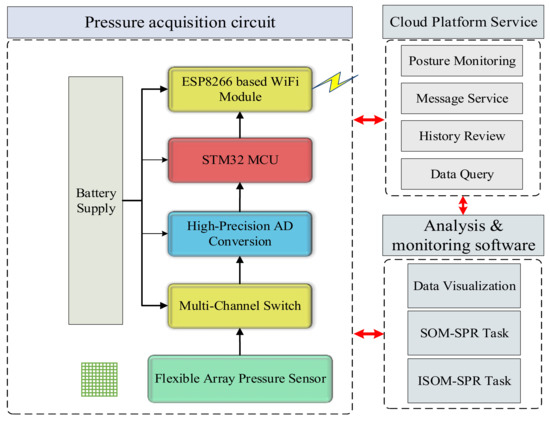 The block diagram of the sitting posture recognition system is described in Figure 2, which is composed of three main parts: pressure acquisition circuit, cloud platform and analysis and monitoring software.