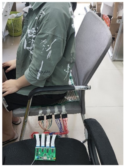 In our experiments, 40 volunteers participated, including 10 females and 30 males. The heights of the volunteers ranged from 1.58 m to 1.81 m, and the weights ranged from 45 kg to 80 kg. Participants were asked to sit with six different positions, and we recorded data on each participant’s six sitting postures. During the test, the volunteers sat on the sensor as shown in Figure 15. The whole system is shown in Figure 16a, and the self-made data acquisition circuit is exhibited in Figure 16b.