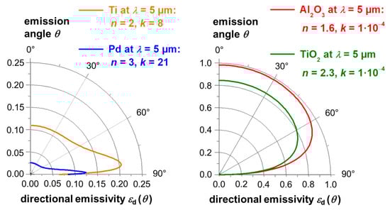 Usually, the directional emissivity of electrically non-conducting materials decreases with increasing emission angle whereas the directional emissivity of electrically conducting materials increases with increasing emissions angle. For visualization, the directional emissivity is shown in Figure 1 for different values of the complex refractive index m = n +I·k (with the real part n and the complex part k of the refractive index), which are typical for electrically conducting materials (left side of Figure 1) or electrically non-conducting materials (right side of Figure 1). The calculations have been performed using the formula given in [] for metals and dielectric materials (with non-vanishing, but very small values of k).