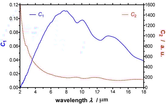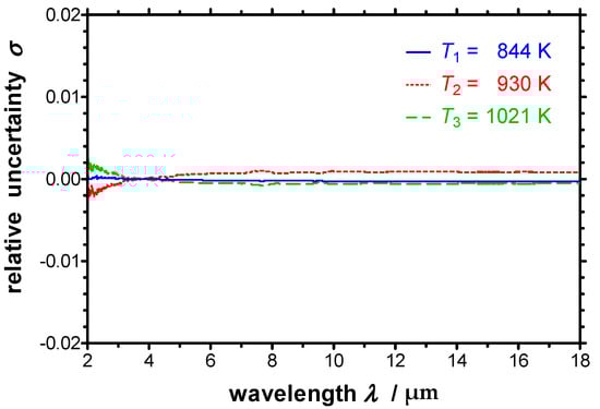 quantifies the attenuation of the emitted radiation by mirrors, apertures, etc., whereas quantifies the gain of detected radiation due to thermal radiation, which is emitted from spectrometer components at near-ambient temperature []. Exemplarily, both calibrating functions and are depicted in Figure 2 as function of the wavelength derived from test measurements. The calibration procedure and the derivation of the calibrating functions and from the calibration measurements on a reference blackbody at three different temperatures are described in detail in Ref. []. The resulting relative uncertainty σ at these three temperatures are given in Figure 3 as function of the wavelength. It can be seen that the relative uncertainty due to the calibration lies below 0.2% and is therefore only of minor relevance.