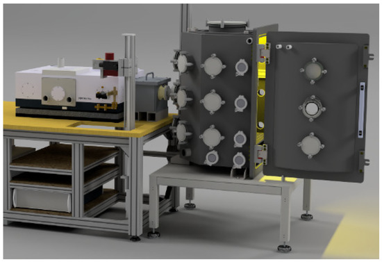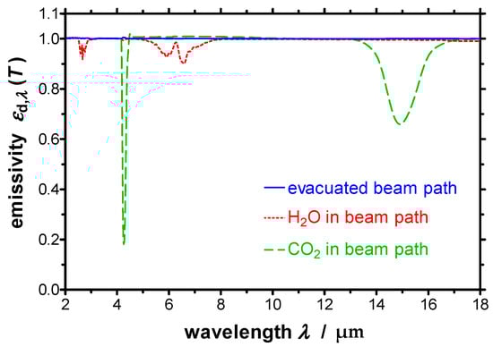 The developed apparatus consists of a double-walled stainless-steel vessel with the internal dimensions (600 × 600 × 900) mm3. Working in vacuum eliminates the influence of infrared-active gases such as water vapor or carbon dioxide (see Figure 6) and avoids oxidation of the specimen. The temperature of the double walls of the vessel can be tempered very homogeneously with a stability of ±0.5 K using a heat transfer fluid and a thermostat. This provides a constant and homogeneous temperature of the surrounding, which is essential for deriving the spectral directional emissivity according to Equation (2). A black paint, the Nextel-Velvet-Coating 811-21, serves as high emitting coating which is applied on the interior of the vacuum vessel. This coating exhibits a spectral emissivity of 0.975 ± 0.010 in the relevant infrared spectral region [].