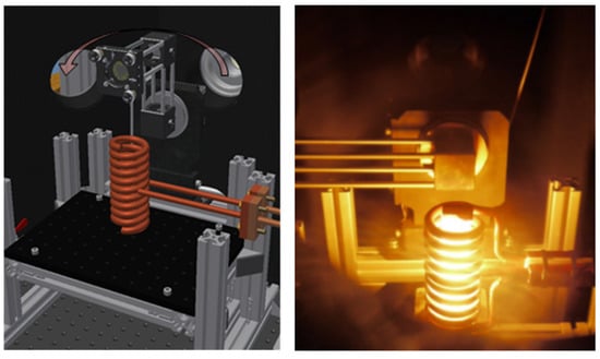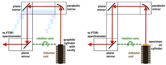 The inductor, which is used for heating the specimen and the blackbody, respectively, consists of a copper coil, which is internally water-cooled (see Figure 7). A high frequency alternating current induces eddy currents either inside the specimen itself or inside a supporting graphite cylinder on which the specimen can be placed. The graphite cylinder (20 mm diameter and 100 mm length) with a conic cavity is placed inside the inductor coil. Therefore, the graphite cylinder serves as a blackbody, too. The walls of the cavity exhibit an emissivity significantly above 0.5. This leads to an emissivity of the cavity larger than 0.99 []. At first, the apparatus can be calibrated using the described graphite cylinder, which is heated to the desired temperature (see left sketch in Figure 8). Afterwards the emissivity of a specimen can be measured by closing the graphite cylinder with a cap and positioning the specimen on the cap (see right sketch in Figure 8). Depending on the material of the specimen, the specimen can then be heated either directly by induction or indirectly from the backside, where the hot graphite cylinder is located. The radiation coming from the blackbody or the specimen, respectively, is guided by different mirrors to the FTIR-spectrometer and is finally detected by the integrated IR-detector. For this purpose, the vacuum vessel is coupled to a Bruker FTIR-spectrometer Vertex 70v as shown in Figure 4. The three mirrors in Figure 8 are mounted on a moveable mirror arm. By tilting the mirror arm around the rotation axis, it is possible to measure the spectral directional emissivity at different angles up to 90° (relative to the surface normal).
