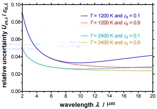 The relative expanded standard uncertainty of the spectral directional emissivity has been calculated at two temperatures (T = 1200 K and T = 2400 K) for a high emissivity of εd,λ = 0.9 and a low emissivity of εd,λ = 0.1 as a function of wavelength, respectively. The resulting relative uncertainties are depicted in Figure 10. The relative uncertainties lie significantly below 10% for all wavelengths and below 4% for most wavelengths.