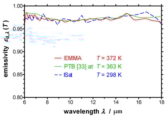 At first, the results of the measurements of the Nextel-Velvet-Coating 811-21 are presented. The spectral directional emissivity εd,λ of the paint was measured normal to the specimen surface at different temperatures from 325 K to 420 K. In this temperature range εd,λ of the Nextel-Velvet-Coating is almost constant. Figure 11 presents the resulting spectral directional emissivity normal to the surface between 6 µm and 18 µm at T = 372 K in comparison with εd,λ measured at ambient temperature using an integrating sphere (IS). Additionally, the spectral directional emissivity measured previously at the Physikalisch-Technische Bundesanstalt (PTB) at T = 363 K [] is plotted in Figure 11. Thereby, the values presented in Ref. [] are in agreement with recent measurements of PTB published in Ref. []. One can see that εd,λ is almost independent of wavelength and lies around 0.975. Furthermore, the values derived in this work and the values taken from literature are in a good accordance.