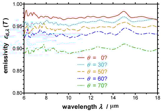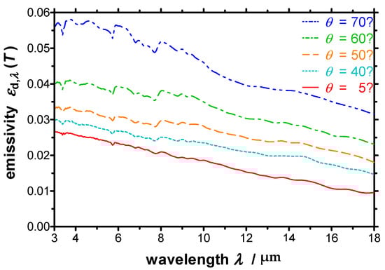 Besides, the spectral directional emissivity of the Nextel-Velvet-Coating 811-21 was measured at different emission angles from θ = 0° (normal to the surface) to θ = 70° at a temperature of T = 372 K (Figure 12). εd,λ decreases with increasing emission angle, as expected for an electrically non-conducting material. The spectral trend of the emissivity is similar for all emission angles.