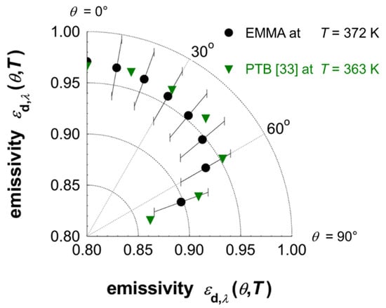 Finally, the total directional emissivity εd at T = 372 K was calculated according to Equation (3). The resulting total directional emissivities are shown in a polar diagram (Figure 13) for different emission angles. For comparison the corresponding values derived at PTB at T = 363 K [] are also depicted in Figure 13. There is also a good agreement between the values presented in Figure 13. Only for emission angles above 30° slight differences between the total directional emissivity determined at ZAE Bayern and PTB are visible, which are within the expected uncertainties.