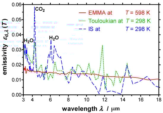 Figure 14 reports the spectral directional emissivity near-normal to the surface for wavelengths between 3 µm and 18 µm measured at a temperature of T = 598 K together with εd,λ measured at ambient temperature using an integrating sphere (IS). Additionally, published data taken from Ref. [] is given in the graph for comparison. The spectra measured at ambient temperature show a CO2-peak at λ = 4.3 µm and H2O-bonds around 3 µm as well as between λ = 5 µm and λ = 8 µm, which are not present in the spectrum measured at T = 598 K with the EMMA (Figure 14). This is because the integrating sphere is placed outside the evacuated compartment. Again, a good agreement between the values can be seen. εd,λ measured at ambient temperature is slightly lower than the one measured at elevated temperature. This is because the emissivity of a metallic surface increases with increasing temperature.