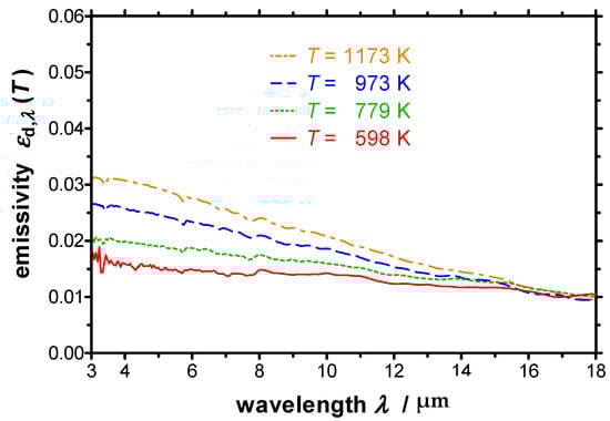 The spectral directional emissivity of the polished copper specimen measured at a temperature of T = 973 K and different emission angles between 5° to 70° (relative to the surface normal) is depicted in Figure 16. The emissivity increases with increasing emission angle, as expected for an electrically conducting material. In this case, the measurement was performed at an angle of 5° instead of 0° to avoid that radiation from the spectrometer or the detector, respectively, and was reflected directly back to the detector by the specular reflecting copper surface. No significant oxidation of the copper specimen occurred as the measurements were performed under vacuum with a pressure below 10−3 mbar.