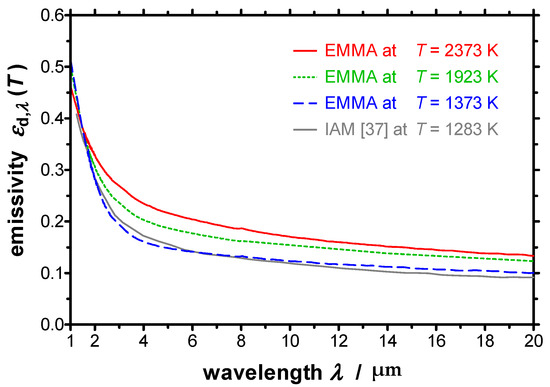 Finally, tungsten, which is a refractory metal, serves as a high-temperature resistant material and has been investigated at temperatures up to T = 2373 K. For this purpose, Laboratoire National de Métrologie et d’Essais (LNE) has provided tungsten specimens, which have been further prepared by Physikalisch-Technische Bundesanstalt (PTB). Prior to the measurements reported in this work, the tungsten specimen has been annealed at ZAE Bayern at a temperature of 2400 K for several hours to assure defined properties and reproducible results together with a roughness of about 1 µm. The resulting spectral directional emissivity normal to the surface measured with the EMMA can be found in Figure 17. For comparison a curve derived by the Institut für Angewandte Materialtechnik (IAM) at the University of Duisburg-Essen at a temperature of T = 1283 K [] is additionally plotted in Figure 17. It can be seen that the emissivity derived at IAM is in a good agreement with the emissivity measured with the EMMA at a similar temperature.