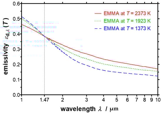 For a more detailed discussion, a logarithmic plot of the spectral directional emissivity is depicted in Figure 18. It is clearly visible that the spectral curves of the emissivities at different temperatures are all intersecting in one point, the so-called crossover point or X-point. The wavelength of the X-point can be determined to λX = 1.47 µm. For the resulting spectral directional emissivity at the X-point the temperature-independent value has been achieved by the EMMA measurements. In Ref. [] the wavelength and the emissivity at the X-point are given as λX = 1.41 µm and , which is in a good accordance with the EMMA measurements, too.