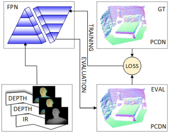 We employed the FPN [32] architecture for point cloud filtering purposes, built on the FPN architecture presented in Section 2.2. In the first phase, the depth information is stored as a 2D image, from where we can reproduce a point cloud in the 3D space. Intuitively, each pyramid can be interpreted as a different level of support for noise computation, making this design suitable for a multi-scale approach.