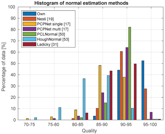 The histogram of the normal estimation for different methods. It can be see the distribution of quality across the data. (For example, for our method, from the analyzed dataset, approximately 52% of the data returned a quality value between 95 and 100).