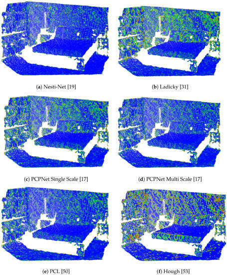The results of the comparison are summarized in Table 1. The best normal estimation performance measured as mean angle error was achieved by our method. The Nesti-Net was in the same range of absolute error, however this method had far the longest evaluation time required for an estimate. In terms of runtime, the PCL and Hough methods were close to our algorithm running on CPU. Although, for PCL we could use the multi threaded PCL, which was ~7 times faster, at least in our case. We also tested the Integral Image method from PCL, and although it was about as fast, or even faster than our method, it produced poor results only around 0.82. Unfortunately, we were not able to find the code for Ladicky [31], only the results for normal estimation on the public dataset used for comparison, so the run time for this method is unknown for us. We would like to note that the runtime of the method used for ground truth [13] is 19.4 s per image. A visual comparison of a typical output for other methods tested in our experiments is visible in Figure 6, for the same point cloud visualized in Figure 4.