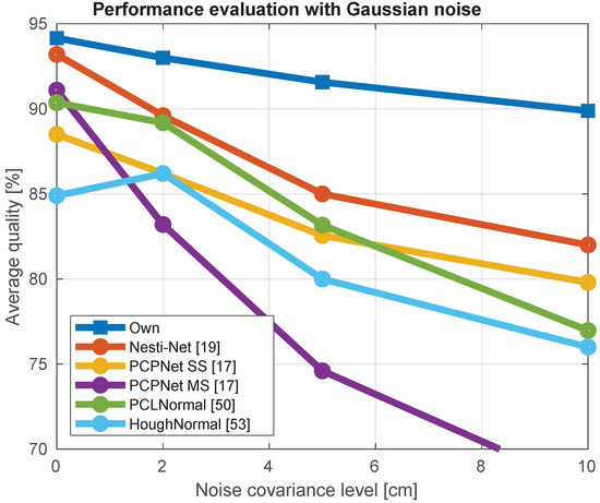 The comparison in terms of average histogram for the different methods is shown in Figure 7. The best performance against the noise robustness was achieved by ToFNest followed by the Nesti-Net [19], while the most affected method was the one based on Hough transforms [53] and the multiscale PCPNet [17].