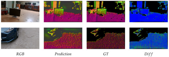 To efficiently encode the normal information for the training, we encoded the normal vectors into the RGB space which we, subsequently, converted at the output to point clouds with the normal vectors. These normal vectors were then compared to the normal vectors of the ground truth point clouds in terms of absolute normal orientation errors. All of these methods returned un-oriented normal vectors, i.e., we considered the orientations vectors the same for the flipped ones. At the output visualization of our estimate, we considered the heat map of the absolute error of the normal orientation, such as this is visible in Figure 4. On this image, we can also see that the predicted normals seem to be slightly blurred at the edges. This could come from the fact that although the FPN works with many different layer sizes, it is not capable of per-pixel normal estimation, which means that in some cases it has a smoothing effect, especially at the edges.