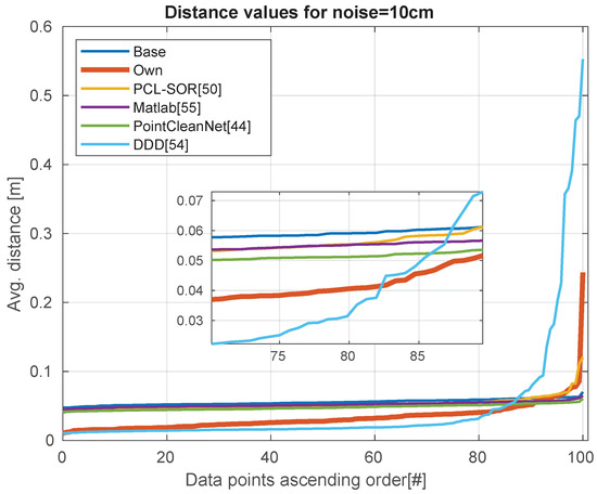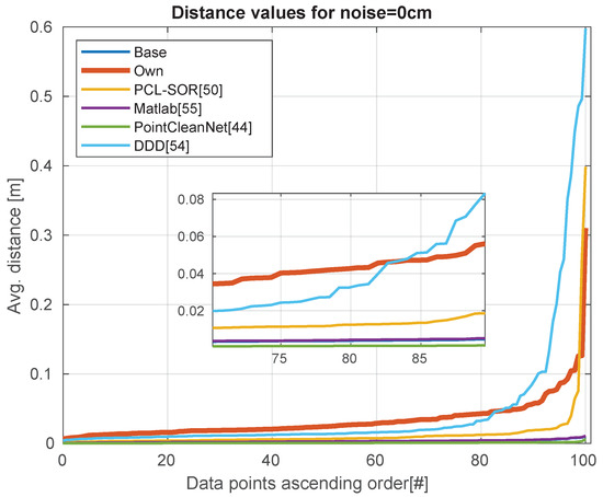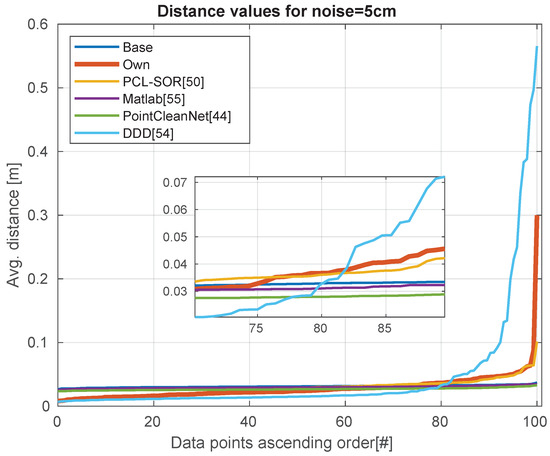 While the PCL-SOR and Matlab remove the outliers from the point cloud, our method and DDD does not delete any of the points, but rather moves them to a position which results in a smoother surface. In the case of PointCleanNet [44], there are two modules: the noise removal module and the outlier removal module. The noise removal module does not remove the points, it reallocates them, while the outlier removal module removes the points, but it does not change their position. In the comparison, we used these two modules together, but they can be used separately, like in the case of calculation of ground truth.