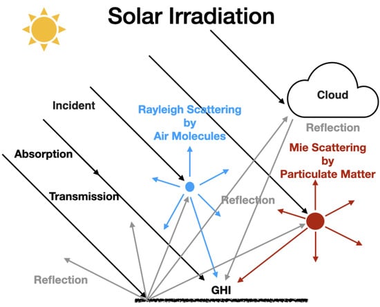 Atmospheric absorption and multiple-scattering of light both have a significant impact on the surface irradiance (Figure 1). Atmospheric radiative transfer considers the energy transfer of electromagnetic radiation through the atmosphere. The intensity of sunlight, as a function of wavelength, is affected by both the gaseous absorption in the UV and visible portion of the spectrum (including O, NO, NO, HONO and HNO [,]), by light scattering from air molecules (Rayleigh scattering), from airborne aerosols (Mie scattering) and by thermal emission in the infrared [,,] (Figure 1).