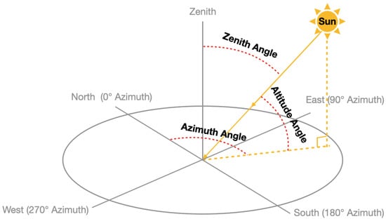 Schematic depicting the solar zenith angle, solar altitude angle and solar azimuth angle.