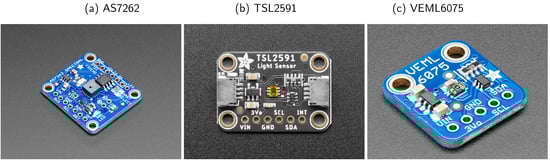 TSL2591 has a sensitivity to the wavelength range 300–1000 nm, from UV to NIR. It gives the raw counts of “Visible”, “IR (Infrared)” photons and the value of “Lux”. The circuit design of Adafruit’s TSL2591 can be found in https://learn.adafruit.com/adafruit-tsl2591, accessed 22 July 2021.