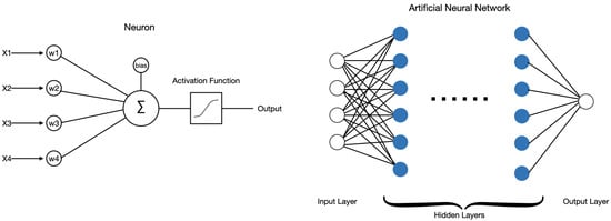 Artificial neural networks (ANN) are composed of an input layer, one or more hidden layers and an output layer []. As shown in the right panel of Figure 5, each layer has one or more neurons. The input layer receives input features, then feed into the first hidden-layer. The outputs of the first hidden-layer become the inputs to the second hidden-layer and so on. The data passes through all the hidden layers and finally arrives at the output layer. Each node in the hidden layers or output layer has an associated set of weights and bias, and it is followed by an activation function. By using back-propagation [,], the gradient of the loss function can be computed with respect to the weights of the network, and the weights can be optimized to fit the model on the training data.