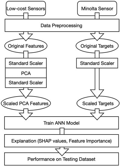 We collected the data form the low-cost sensors and the reference Minolta sensor and performed preprocessing in order to combine and clean the data. Then, we used standard scaler and PCA techniques to generate the scaled PCA input features and scaled output targets for the ANN model. We trained the ANN model on the training data set and explained the model with SHAP values and feature importance. Finally, we tested the performance on the testing data set.